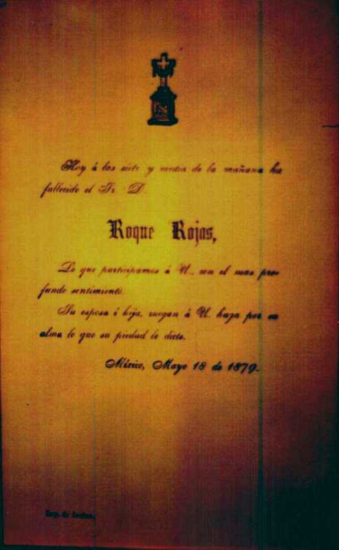 |   Esquela de la muerte de Roque Rojas. anque considerda original por algunos, no existe evidencia firme de su autenticidad. El texto dice:  "Hoy a las siete y media de la mañana ha fallecido el Sr. D. Roque Rojas. Lo que participamos a U. con el más profundo sentimiento. Su esposa e hija urgen a U. haga por su alma lo que su piedad le dicte. México, Mayo 18 de 1879".   |